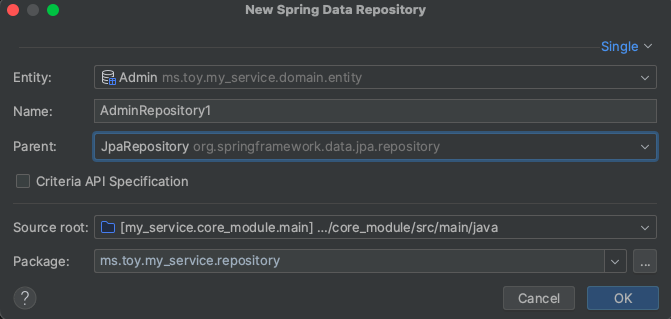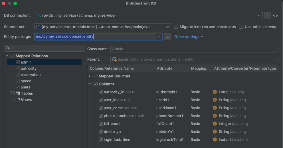 연결할 DB, 멀티모듈이라면 생성될 모듈, 생성될 패키지를 설정 후 'OK' 버튼을 누르면 생성이 된다.