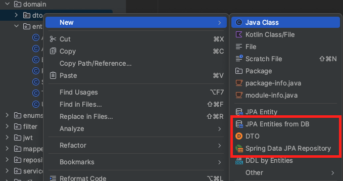 Spring Boot 프레임워크로 개발을 할 때 테이블 설계 후 테이블 관련 클래스인 Entity, Dto, Repository, Mapper의 생성을 도와주는 플러그인이다.
