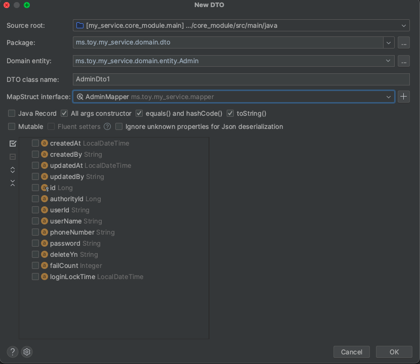 생성될 패키지와 Entity 클래스와 MapStruct 인터페이스를 지정해주면 DTO 생성과 동시에 Entity <-> DTO 간의 매핑 메소드도 생성해준다. Entity와 마찬가지로 생성 후 Lombok, Jackson 어노테이션들은 직접 추가하면 된다.