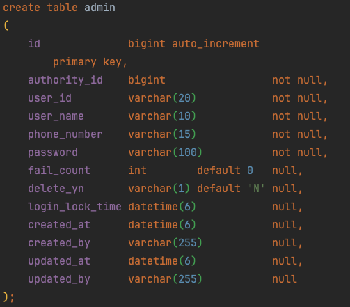 다음과 같은 admin이라는 테이블을 생성 후 해당 메뉴들로 쉽게 생성이 가능하다.