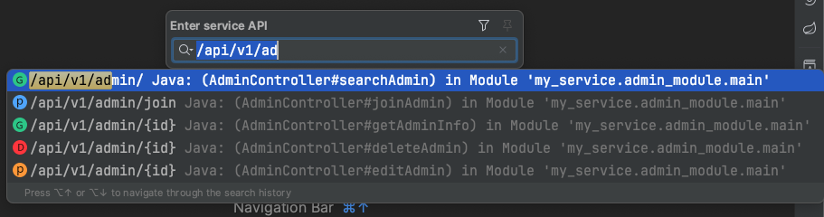 맥북의 경우 ( command + option + / ) 단축키로 검색 창이 열리는데, 정의된 엔드포인트의 자동완성 검색 기능을 제공한다.