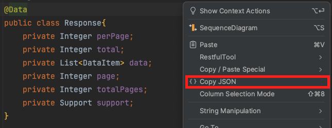 사용법은 매우 간단하다 플러그인 설치 후 DTO 클래스에서 우클릭 > Copy JSON을 클릭하면 복사가 된다.