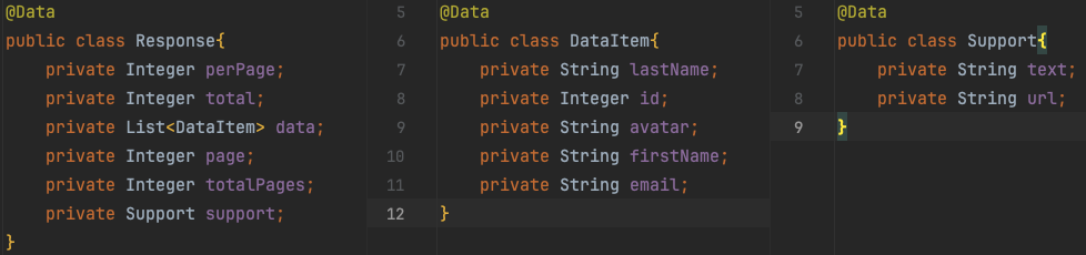 해당 플러그인을 사용해서 복붙한 JSON 데이터다. String 타입의 변수에는 필드명이 포함된 랜덤 문자열이 들어간다.