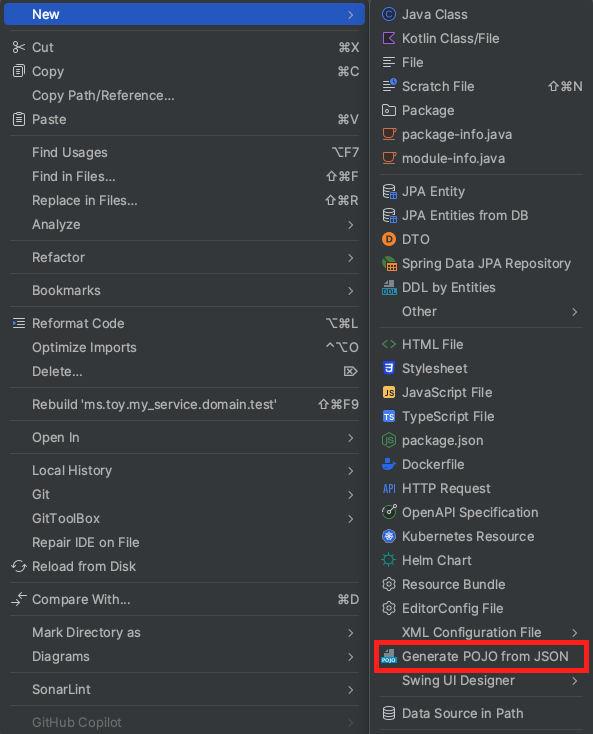 플러그인을 설치하면 Generate POJO from JSON 메뉴가 생긴다.