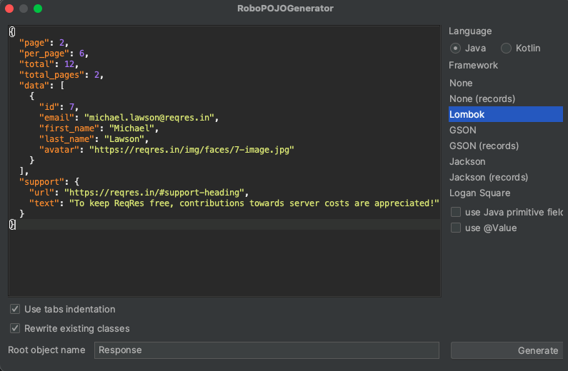 예시로 다음과 같은 JSON 데이터를 복사한 후 Language, Framework, Root Object Name을 설정 후 Generate버튼을 누르면 자동으로 생성된다.